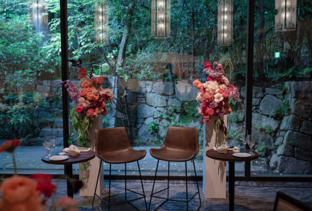 アカガネリゾートの雰囲気に調和する、本物を追究しながらも和のテイストをふんだんに取り⼊れた京フレンチ。世界的賞受賞のグランシェフと名ソムリエが奏でる、⽬にも美しい確かな味わいは、⽼若男⼥問わず⼈気を誇り、ふたりの結婚式を彩ってくれる。