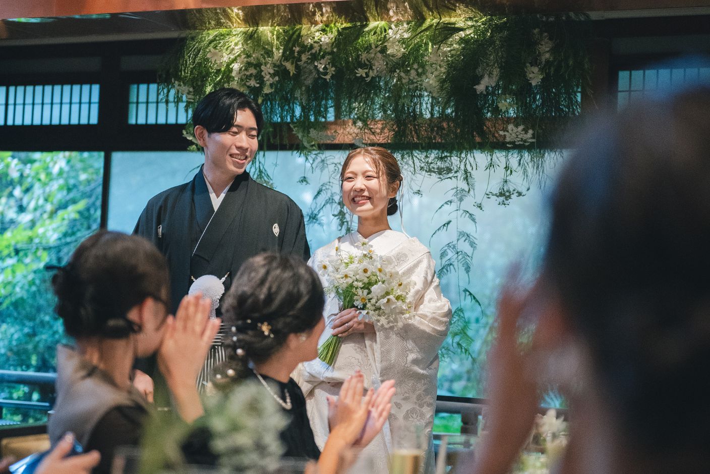 おもてなしを大切にされているおふたりのこだわりはお料理にも。試食会から参加されシェフと打ち合わせをし、京都ならではの食材を使用。「京小蕪のブルーテ」や「甘鯛の鱗焼き」の付け合わせに「京壬生菜」など、AKAGANE RESORTならではの京料理にゲストのお腹と心を満たしました。また、指名されたゲストの方々におふたりとの思い出のお話を披露いただく時間も設けられ、会場は大盛り上がり。和やかなパーティーの様子を新婦様自らカメラに収める瞬間も。ゲストと一体となった、アットホームな空気が満ちた時間となりました。