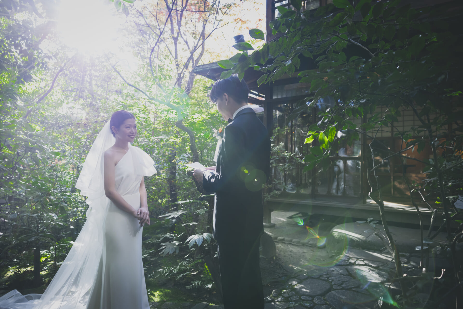 移ろう光が美しく差し込む館内や緑あふれる庭園、落ち着いた雰囲気の中に感じる上質さは、訪れたゲストの心をそっとほどき、特別な時間へと誘ってくれます。そんなロケーションと、丁寧なサービスやお料理へのこだわりなど、一つひとつに宿る「おもてなし」をが、おふたりの理想とする結婚式のかたちとぴたりと重なったそう。